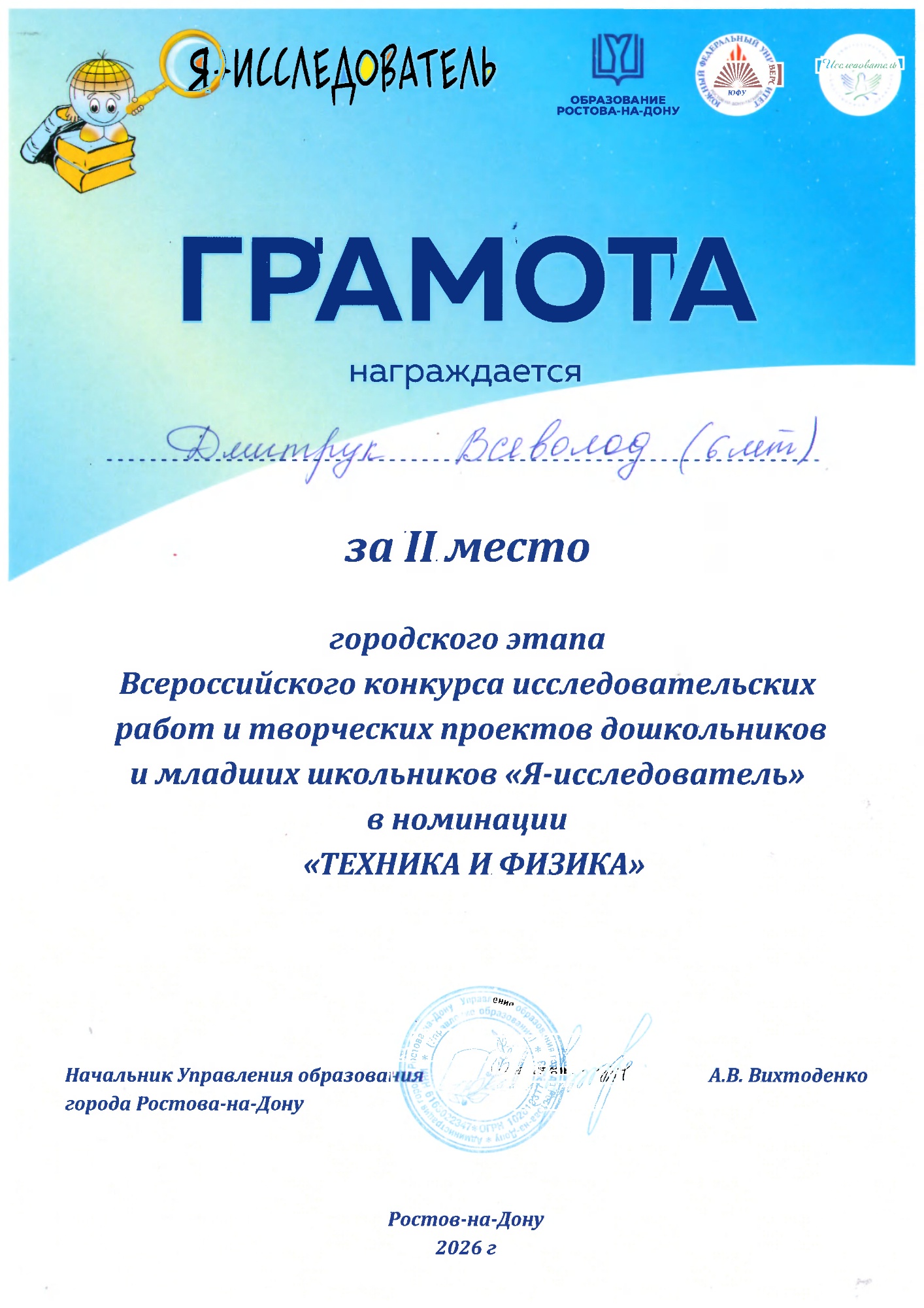 Воспитанник МБДОУ № 251 Дмитрук Всеволод по руководством своего наставника Зарвигоровой светланы Евгеньевны принял участие в городском этапе в номинации "Физика и техника" и занял 2 место с исследовательским проектом "Статическое электричество".